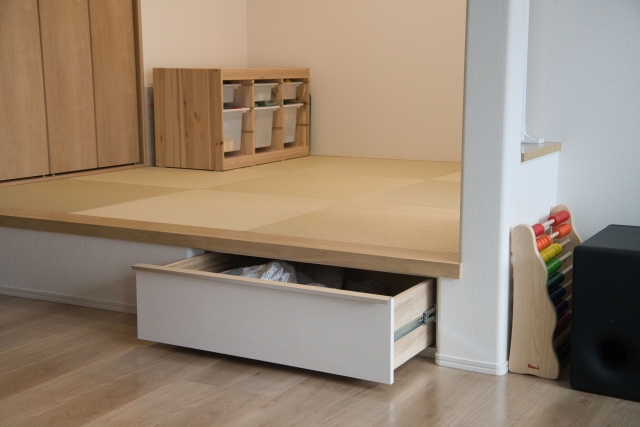 また、段差の下に収納を設けることで、空間を有効活用できるのも大きな魅力。