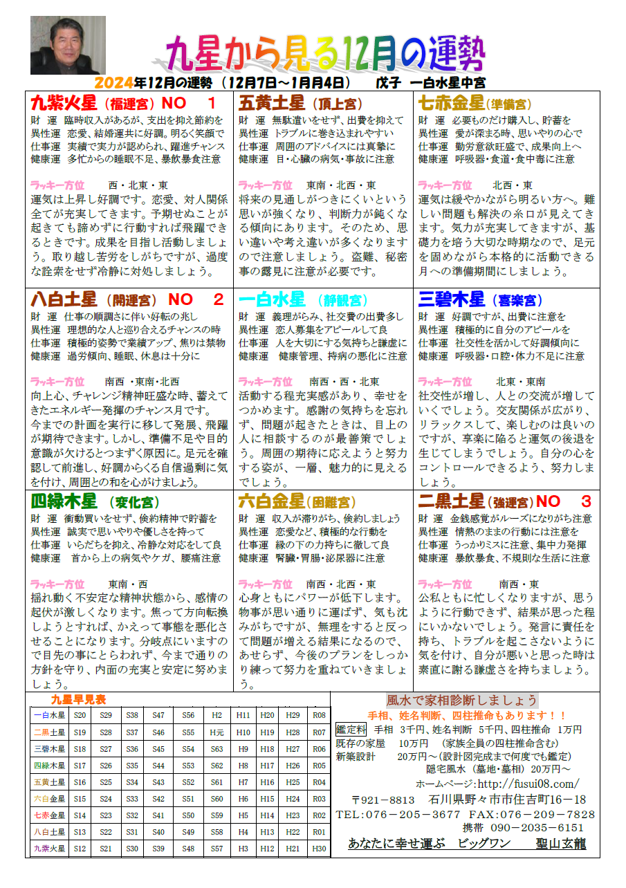 さて、12月の運勢ですが、戊子月、一白水星中宮の月となります。