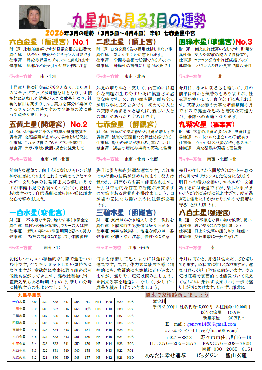 九星から見る今月の運勢表をご覧になって今月の生活の指針にして下さい。