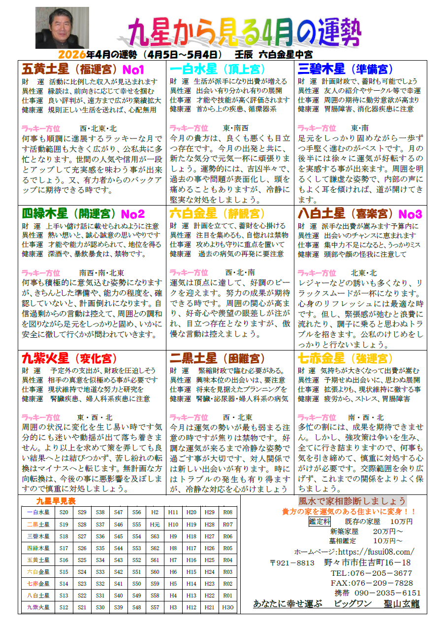 さて、2026年4月の運勢ですが、壬辰月、六白金星中宮の月となります。